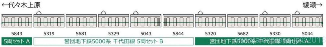 編成例のほか、Aセット×2で綾瀬支線の予備車両を捻出するために組み替えられた3+7両編成を、Bセットはそのままで国鉄常磐線乗り入れ開始までの5両編成を再現できます。( いずれも車番はタイプとなります)
