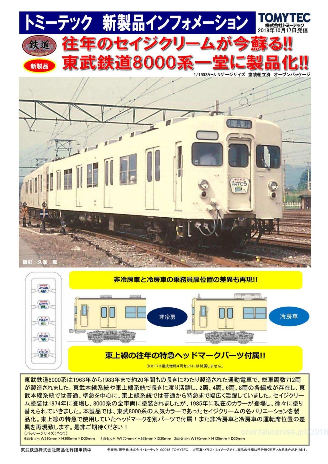 本製品では、東武8000系の人気カラーであったセイジクリームの各バリエーションを製品化。東上線の特急で使用していたヘッドマークを別パーツで付属!また非冷房車と冷房車の運転席位置の差異を再現致します。是非ご期待ください!