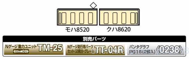 動力ユニットは20m級A2 TM-14 、走行化パーツはTT-04Rグレーを指定。パンタグラフは<0238>PG16を推奨します。
