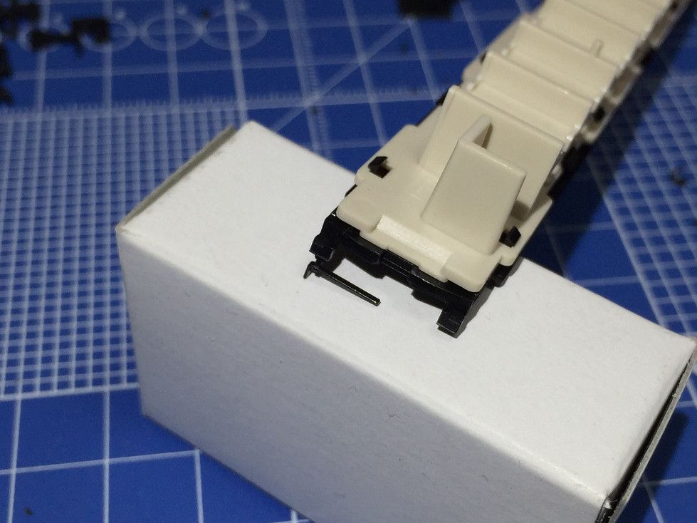 最初に加工したナックルカプラーをGクリヤーで床下に張り付けました!